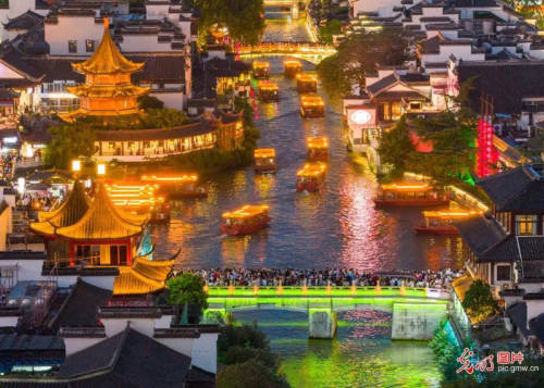 2025年8月3日,游客在南京市夫子庙景区游玩。游客或乘船游览,或驻足观赏,或品尝美食,或挑选特色商品,沉浸式感受独特的江南水乡魅力,点燃城市“夜经济”。(方东旭摄/光明图片)