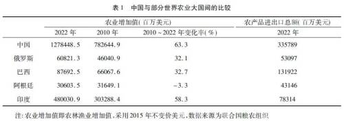 农业现代化道路与各国资源禀赋密切相关,人口密度大而土地资源极为稀缺的东亚国家,整体农业劳动生产率更低,建设农业强国的实现难度更大。结合中国具体国情来看,虽然受制于土地经营规模偏小的约束,但与德国、法国、荷兰、以色列、日本等国土体量相对较小国家的实现道路有明显不同,中国作为世界农业大国,要建设的是综合型农业强国。综合型农业强国首先能够依靠自身力量解决本国国民的粮食安全问题,在国际农产品贸易中占据重要地位,并且农业的各个部门、领域和主要环节都要强,这类国家以美国为典型代表。目前来看,具备建成综合型农业强国条件的有中国、俄罗斯、巴西、阿根廷、印度等农业大国,这些农业大国均为发展中国家。对比来看,中国的谷物、小麦、稻谷、花生、籽棉、茶叶、肉类、羊毛等粮食和农产品产量多年稳居世界第一,农业增加值的体量和增速也明显领先其他四国(表1)。2022年中国农业增加值是巴西和阿根廷总和的近11倍,是印度的2倍多,2010~2022年增速是俄罗斯和巴西的近2倍。2022年中国农产品进口额居世界第一位,出口额世界第四,已成为世界农产品大市场,农产品进出口总额高于其他四国总和。
