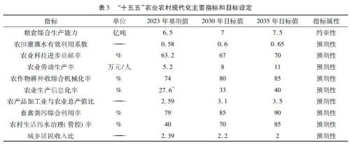 中国提出在2035年基本实现农业农村现代化的目标,综合农业农村发展成效和变化趋势,从“十四五”时期若干关键指标的实现程度来看,该目标已经具备较好的实现基础。农业农村现代化各项指标目标值的尽快实现,对于奠定农业农村现代化实现基础,加快迈入农业强国行列至关重要。参考《中华人民共和国国民经济和社会发展第十四个五年规划和2035年远景目标纲要》《“十四五”推进农业农村现代化规划》《乡村全面振兴规划(2024—2027年)》《加快建设农业强国规划(2024-2035年)》等规划文件,把握世界农业强国的共同特征,突出农业农村现代化的中国特色,借鉴国内相关领域知名专家学者的研究成果,构建包括粮食综合生产能力、农业劳动生产率、农业科技进步贡献率等在内的10项农业农村现代化主要指标,依据相关规划中设定的指标及目标值,采用多种增长率预测和趋势推断方法,明确2030年和2035年农业农村现代化主要指标的目标值(表3)。