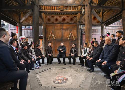 3月17日至18日,中共中央总书记、国家主席、中央军委主席习近平在贵州考察。这是17日下午,习近平在黔东南州黎平县肇兴侗寨考察时,在信团鼓楼同村干部和村民代表围坐在火塘边,共话乡村全面振兴。新华社记者 谢环驰 摄